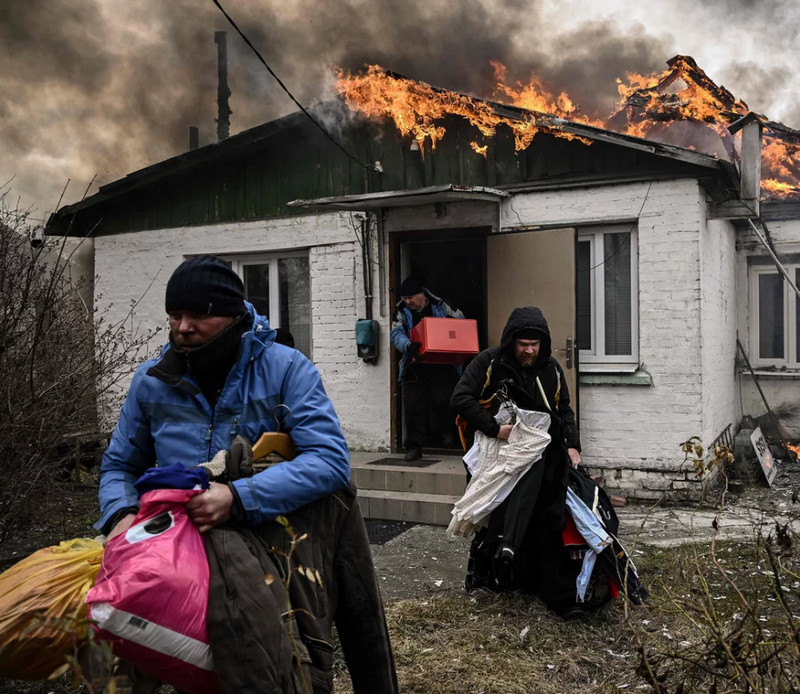 People remove personal belongings from a burning house