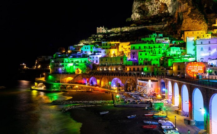 It may sound unlikely to visit the Amalfi Coast during the winter holidays but Atrani’s “Stelle Divine” events are sure to stave off the cold weather blues and delight locals and visitors alike.Each year, the historic fishing town is illuminated in bright colors, creating a magical atmosphere along the coast. A carpet of red lights lines the Duomo while town’s arcades and streets are turned blue, green, pink and purple during the holidays