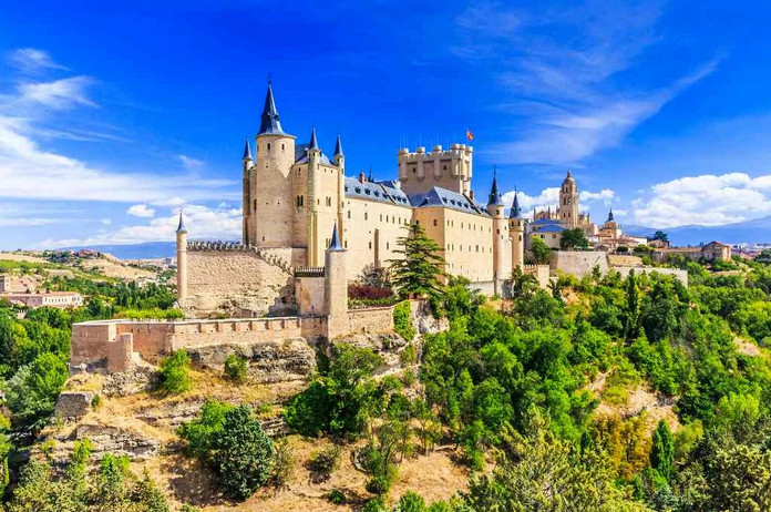The Alcázar of Segovia, located 53 miles northwest of Madrid, was originally built as a fortress on a hillside between two rivers.