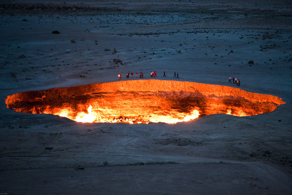 This gas crater was created by people. It’s called the “Gates of Hell” and it’s been almost half a century since the fire that was lit in 1971. There was a ground collapse while drilling and natural gas started to come out. The diameter of the hole is almost 200 ft, while its depth is about 65 ft.