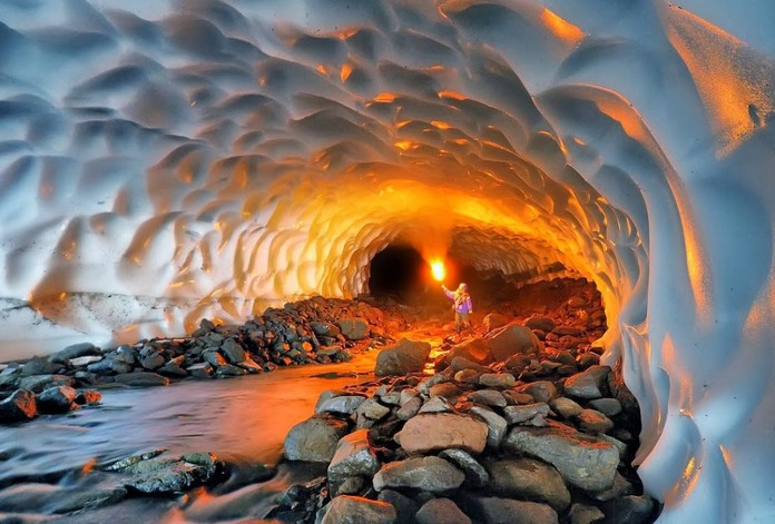 The Mutnovsky volcano, where scientists have discovered an ice cave, is located on the Kamchatka Peninsula in Russia. The volcano and the ice cave are next to each other.