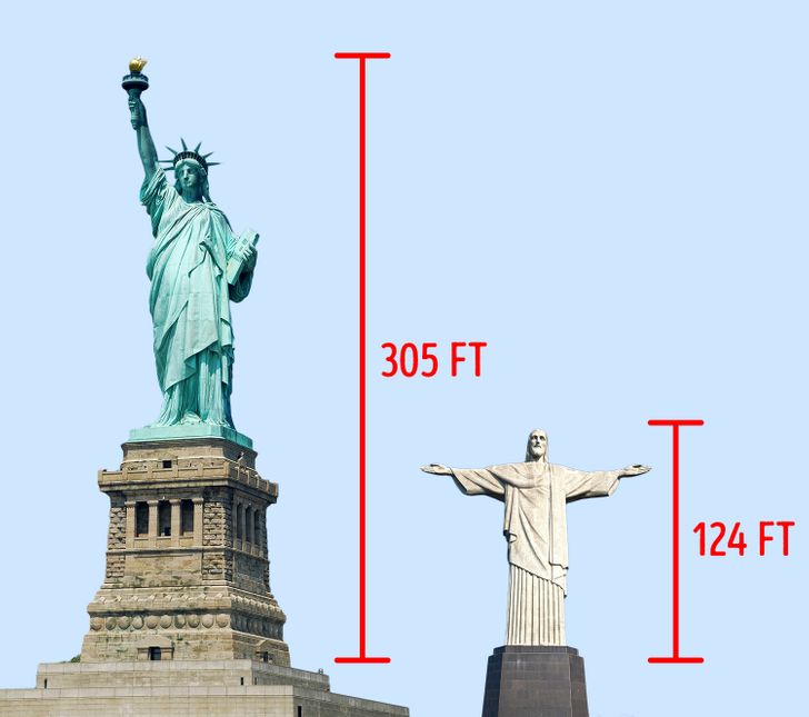 The statue of Christ the Redeemer in Rio de Janeiro isn’t even bigger than the Statue of Liberty’s pedestal.The height of the statue in Brazil with its pedestal is just 124 ft and the Statue of Liberty’s basement and pedestal are 153 ft high.