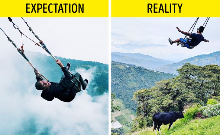 The famous swing at the end of the world in Ecuador is a good example that proves that everything depends on the right angle. When you look at these incredible pictures, it seems like there’s just an abyss under your feet but there’s actually just a steep hill.