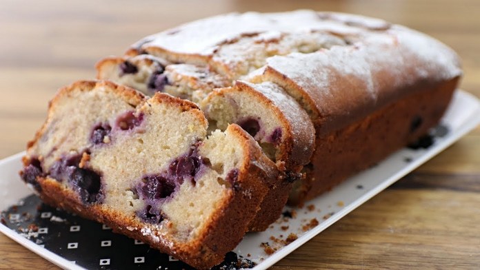 With the mixer on low speed, beat until almost combined. Add blueberries and gently fold into the batter. Transfer to the prepared pan.