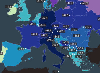 The Winner is, of course, Russia, at least its European part, with -58.1 °C. Other “-50 °C or lower” members are Norway, Sweden, and Finland.