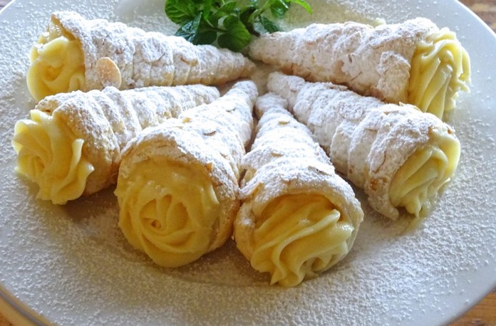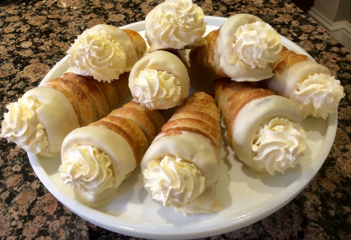 For the cream horns, cut the pastry sheets into strips of 1.5cm wide (¾ inch wide), wrap one strip in a spiral fashion starting at the tip and overlap the edge, you will need 2 strips per mold, brush the horns with beaten egg and add some flaked almonds, bake immediately in a preheated oven, 180ºC (350Fº) for 15 minutes or until the pastries are golden, cool down and remove the molds.When ready to fill the pastries remove the cream from the refrigerator mix with a spatula and fold the whipped cream through, fill the cream horns with a piping bag and garnish to taste.