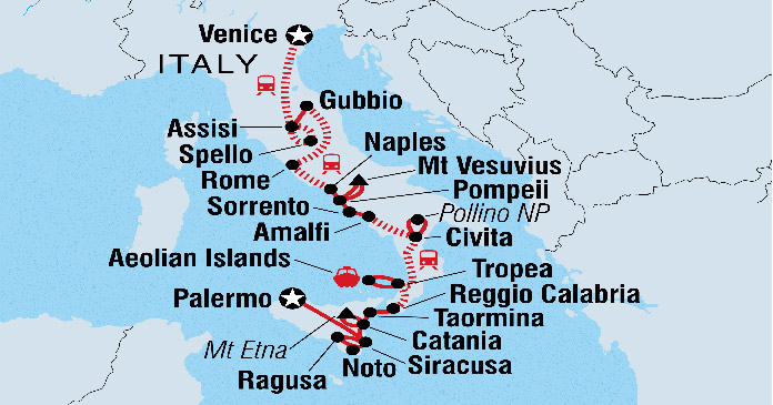 Visit the most sacred places in Italy as you travel from Venice to Sicily, via the Umbrian hilltop towns of Gubbio and Assisi.Continue to Italy’s ‘Eternal City’ of Rome and learn about the catastrophic fate of Pompeii. Soak up the sunshine in beautiful Amalfi…