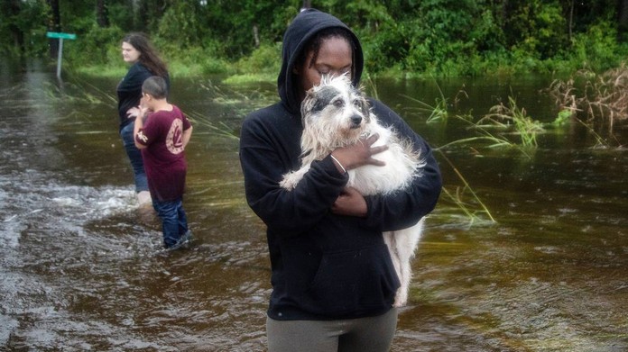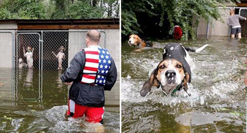 The video shows the dogs whimpering as volunteer rescuer, Ryan Nichols, of Longview, Texas, wades through the water to reach them.As soon as he frees the animals, all the dogs swim out towards the volunteers.