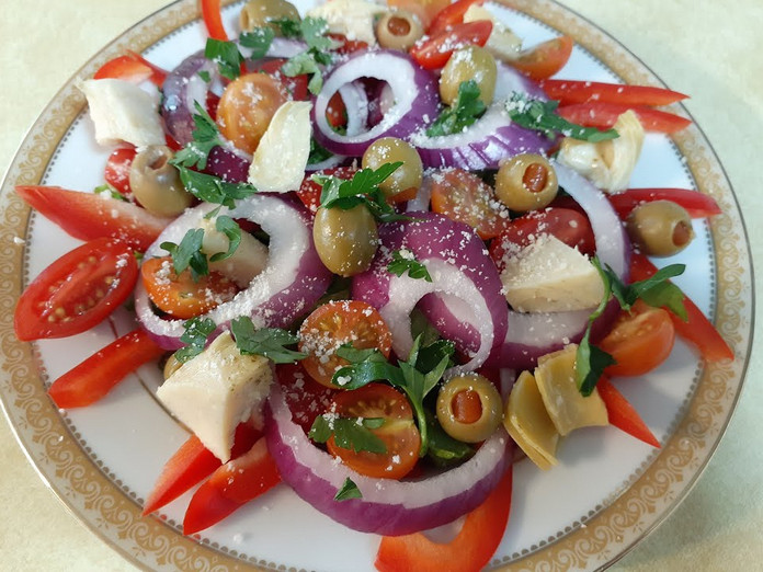 2 cups lettuce, 1/4 cup sliced red onion, 1/4 cup green olives, pitted, 1/2 cup red cherry tomatoes (then sliced), 1/2 cup orange cherry tomatoes (then sliced), 1/4 cup sliced red bell pepper, 1/4 cup artichoke (then sliced), 1 tbsp chopped fresh parsley, 1 tbsp grated parmesan cheese, Oil, and vinegar dressing
