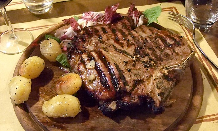 Bistecca alla Fiorentina, (beefsteak Florentine style) consists of a T-bone steak from the Chianina or Maremmana breeds of cattle.Probably the most traditional dish of Tuscan cuisine, the steak is grilled over a wood or charcoal fire