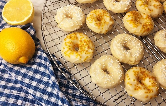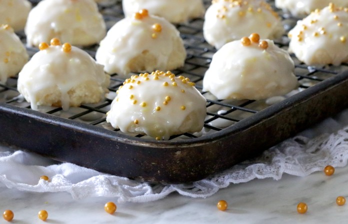 While the cookies are baking whisk together the confectioners sugar, lemon juice and butter until smooth. While the cookies are still hot from the oven dip them in the glaze. Decorate with sprinkles as desired.
