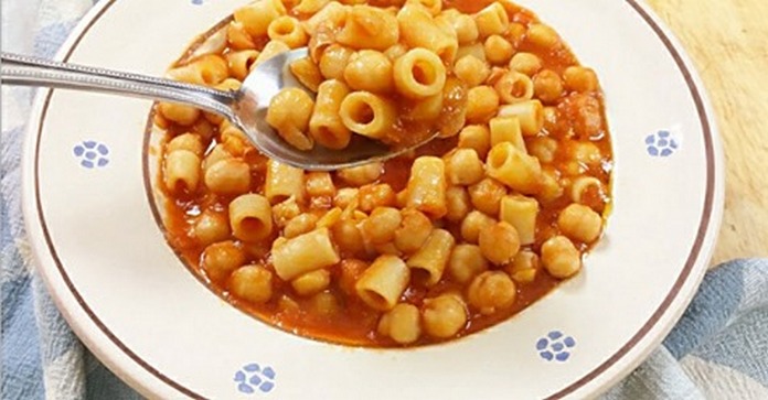 Boil the Ditalini pasta in salted water. Pour the chickpeas and broth over the pasta.