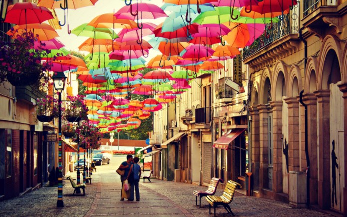The floating umbrellas are an example of street art that takes inspiration to the installations that already colored the streets of Portugal, Barcelona & London.