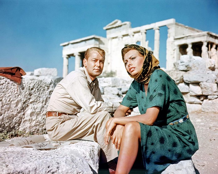 For those filmgoers who were seeing her for the first time, Loren would never again belong just to Italy. Released in 1957 the romantic film was shot in Greece.The film is noteworthy as Sophia Loren’s English language debut. She also used her Greek language skills to sing “T’in’afto pou to lene agapi” (What is this they call love?) in Greek and do a bit of Greek dancing in the process. Opposite Loren were stars Alan Ladd & Clifton Webb. Hugo Friedhofer’s score was nominated for a Best Music at the 1958 Academy Awards.