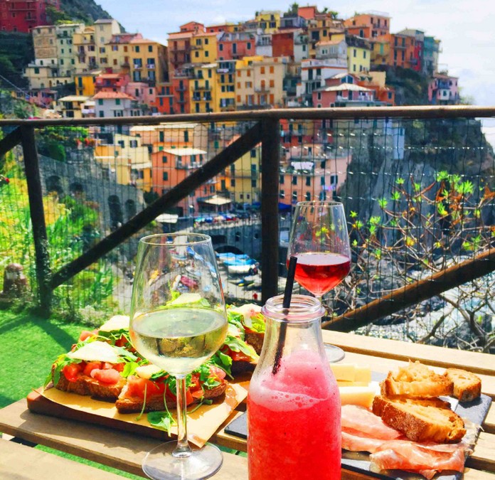 At the top you can see the fantastic drink that you can enjoy at “Nessun Dorma in Manarola” a local dream to peak of the Cinque Terre.A wine bar where you can taste the Liguria. Breathtaking scenery on the sea Manarola, Cocktail, cutting boards and bruschetta with products at zero km.