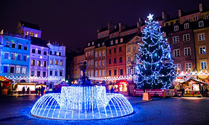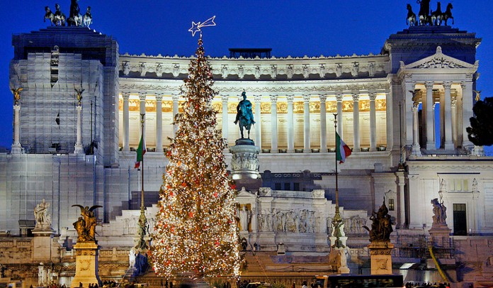 Rome’s imposing Monument to the Fatherland (Altare Della Patria) was built to commemorate the unification of Italy. During the holidays, the monument is at its most festive as a lovely backdrop to the Eternal City’s main Christmas tree.